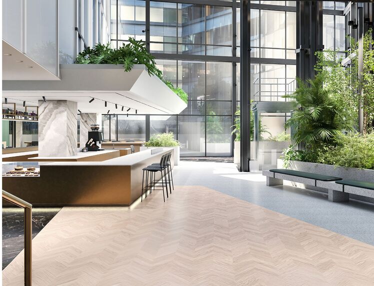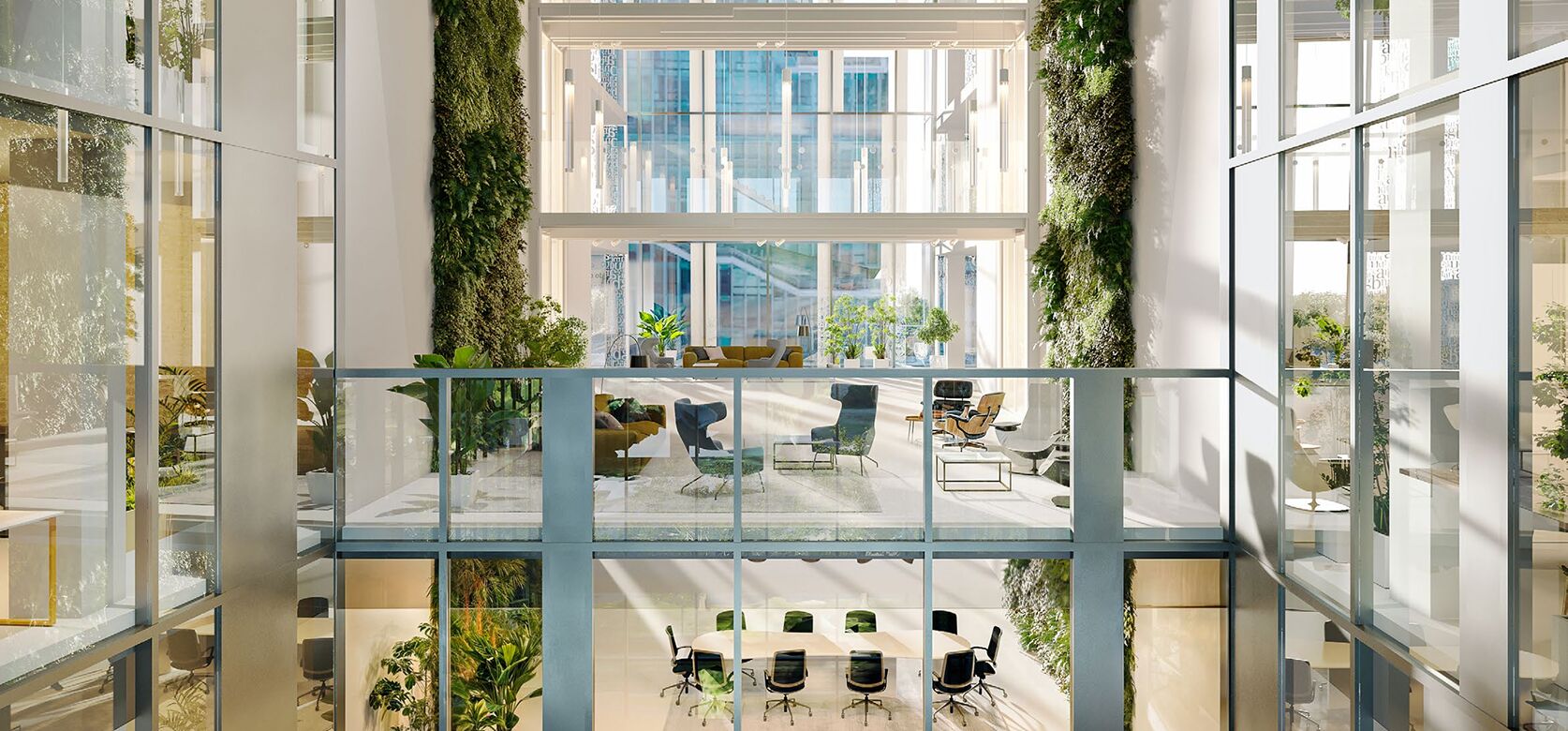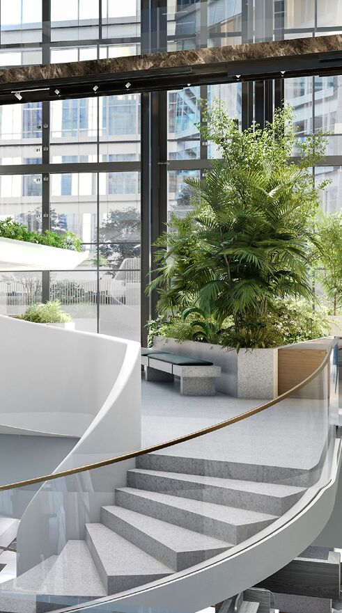 A spiral signature staircase provides direct access from the ground floor to the mezzanine floor. This is the place where tenants come together—to meet, inspire, work, or relax. From this space, one enjoys a fantastic view of the atrium that soars 90 meters into the sky. Throughout the day, a barista-staffed coffee bar serves the finest beverages, breakfast, lunch and afternoon snacks.
