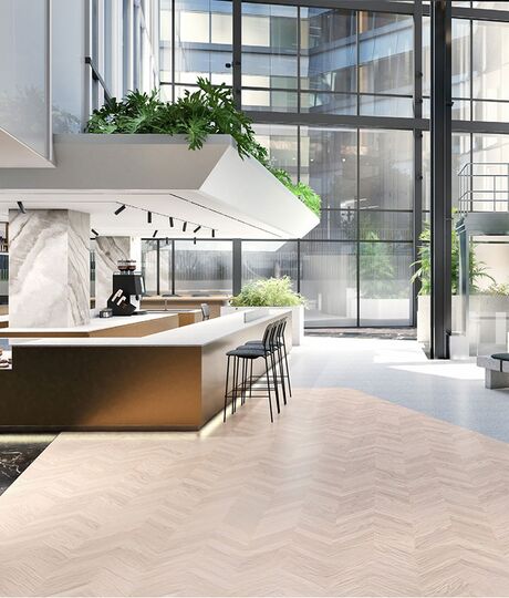 Its exterior, rugged like a rock in the surf, commands attention. But step inside, and the transformation is remarkable. The open lobby with a 7.2-meter ceiling height bathes in warm light, featuring natural stone floor tiling and exquisite oak wooden accents. Here, users and visitors receive a hospitable welcome at the reception desks.
