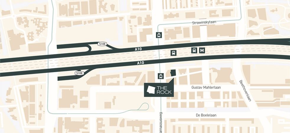 The Rock is situated adjacent to Amsterdam Zuid train station. Schiphol Airport is a mere 6-minute train ride away. You have multiple transportation options, including trains, metros, trams, buses, or bikes, allowing you to reach Amsterdam's city center in just 5 minutes. The accessibility will be further enhanced through the 'Zuidasdok' infrastructure project, which involves expanding the train station and burying the A10 highway underground.