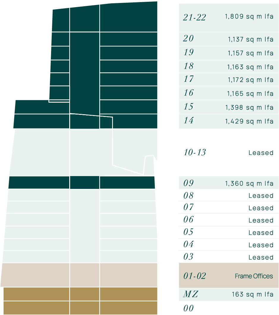 - Two glass panorama lifts providing access to the MZ, 2nd, 5th, 8th, and 10th floors